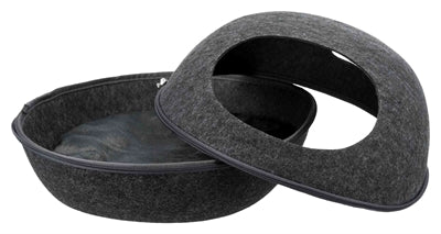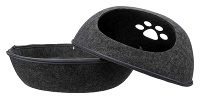 Trixie Relax Iglo Liva Antraciet 40X24X47 cm Deze Trixie Relax Iglo Liva Kattenmand Antraciet 40X24X47 cm is een heerlijk mandje met een ronde vorm. In dit mandje zou je het liefst zelf willen gaan liggen! Dit gezellige kattenhuisje is rond van vorm, met aan de voorkant een gat dat toegang biedt voor de kat. Heerlijk veilig en knus slapen dus! Het huisje is gemaakt van vilt (polyester), wat er niet alleen leuk uitziet, maar er ook voor zorgt dat het huisje isolerend en vuilafstotend is. Het huisje komt met een kussen met polyestervlies vulling en pluche bekleding. Ook heeft de iglo een ritssluiting rondom, en kun je het gehele mandje in elkaar plaatsen en dus ruimtebesparend opbergen. Een heerlijk knus en origineel mandje voor jouw kat!