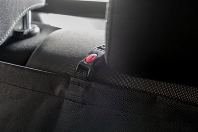 Een deel van de deken kan worden opgeklapt waardoor er ook nog iemand op de achterbank naast de deken kan zitten. De deken is voorzien van metalen pinnen waardoor de deken stabiele vorm heeft en houdt tijdens de rit. Door de sleuven in de deken kun je je hond makkelijk vastmaken aan de riem.