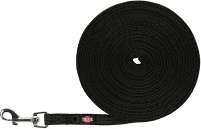 Trixie Hondenriem Sleeplijn Met Rubber Bekleed Zwart 10 m x 1,5 cm De Trixie Hondenriem Sleeplijn Met Rubber Bekleed Zwart 10 m x 1,5 cm is een sleeplijn bekleed met rubber voor meer grip en bescherming tegen weersinvloeden. Door deze combinatie en de lengte van 10 meter kun je jouw hond in elke situatie en elk seizoen meer bewegingsvrijheid geven. Door de bekleding met rubber is de lijn gemakkelijk te reinigen. De lijn is uitgevoerd zonder handlus en heeft een extra oogje om een hondenpenning of flasher aan te bevestigen.