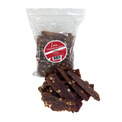 I Am Chicken D'Light Cheese is een snack voor honden, gemaakt van kipfilet en kaas. Deze eiwitrijke traktatie is ideaal als beloning of tussendoortje en geschikt voor honden van verschillende formaten.