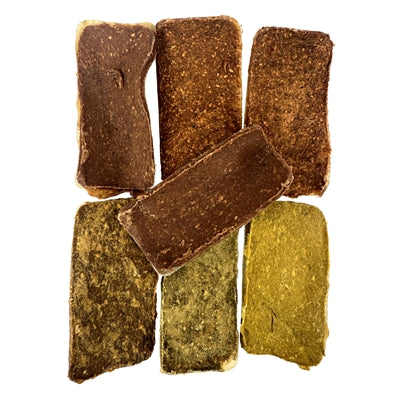 Samenstelling: Buffelhuid (49,5%), rund óf kip óf eend óf kaas (25%), kleefrijstmeel, gelatine (12,8%), gemodificeerd tapiocazetmeel, plantaardige vetten, kurkuma (1,4%).