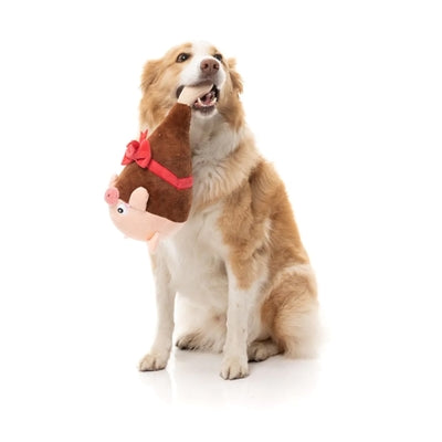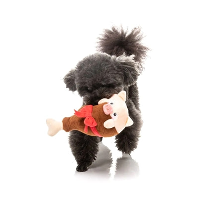 De Fuzzyard Ham A Merry Pigmas Bout is een feestelijk hondenspeeltje in de vorm van een ham met een schattig varkensgezichtje en een rode strik. Dit pluche kerstspeeltje is mega zacht en perfect voor honden die graag knuffelen en spelen.